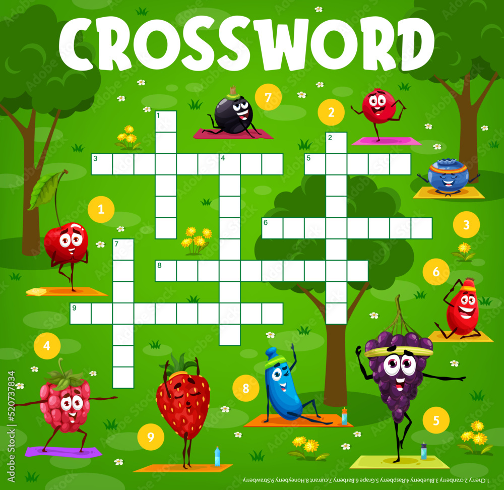 Crossword grid cartoon berry characters on yoga fitness Word search