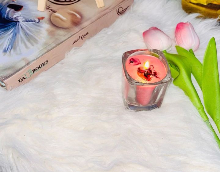 Glass scented candle with a delightful rose petal fragrance adding a