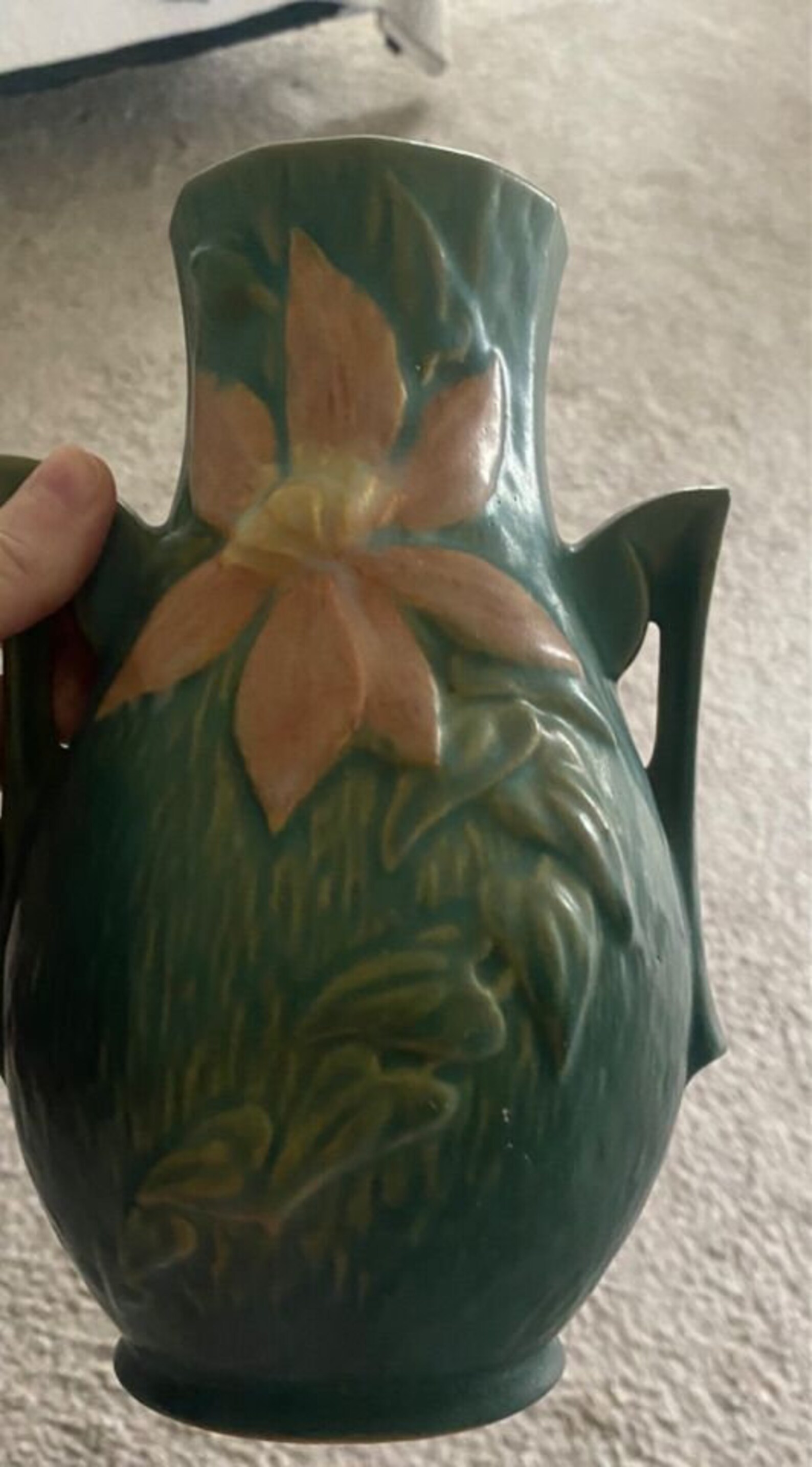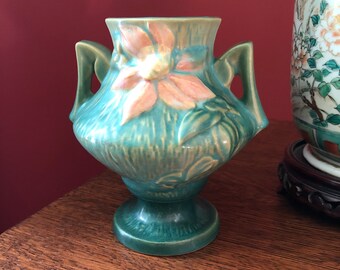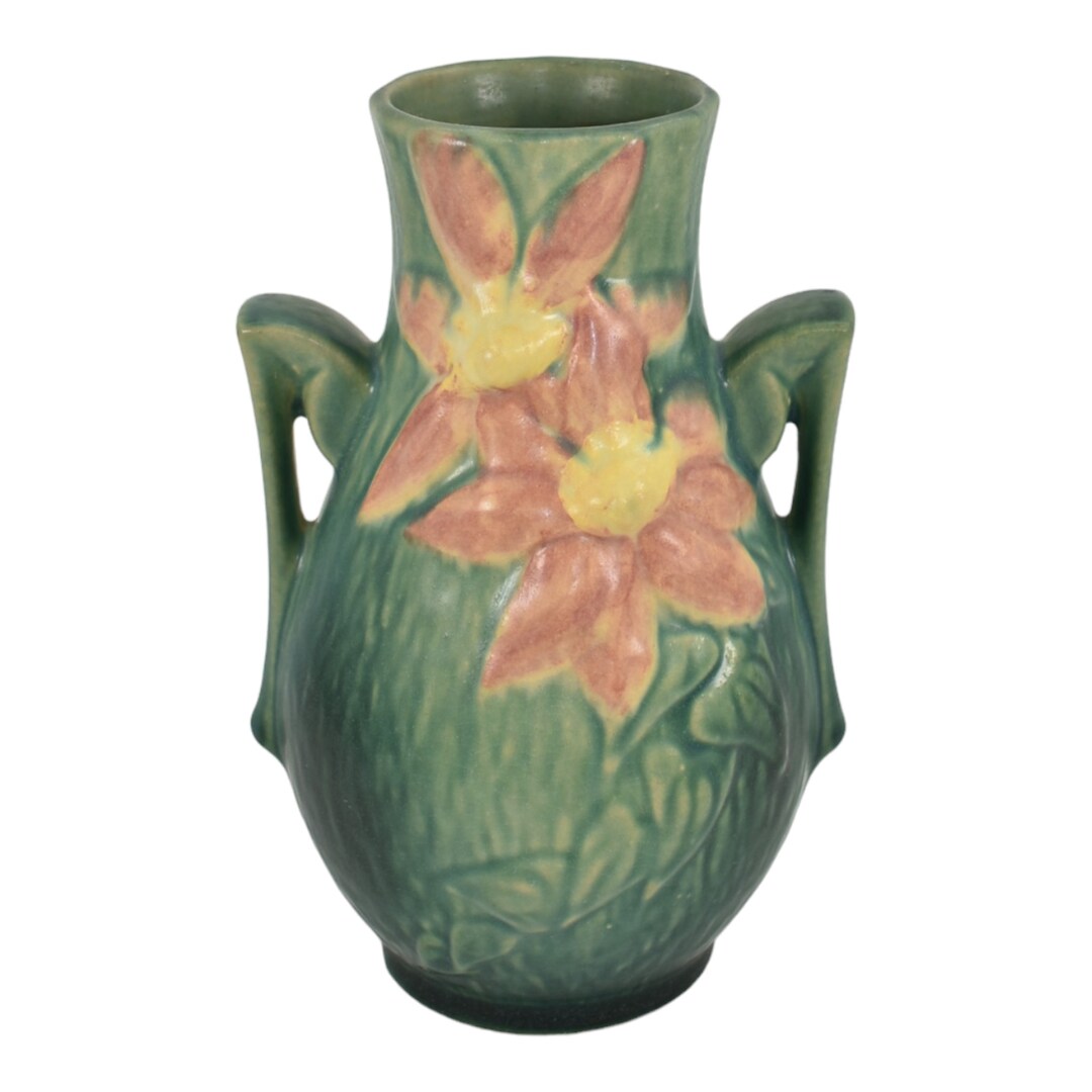 Vintage Roseville USA Clematis Vase Green Matte Pink Flowers 1940s