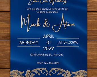 Elegant Royal Blue Gold Wedding Invitation Template Printable