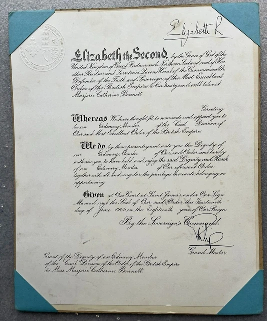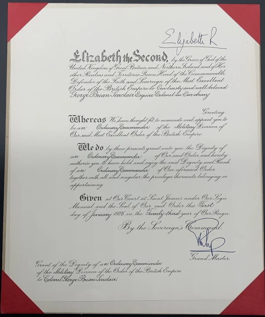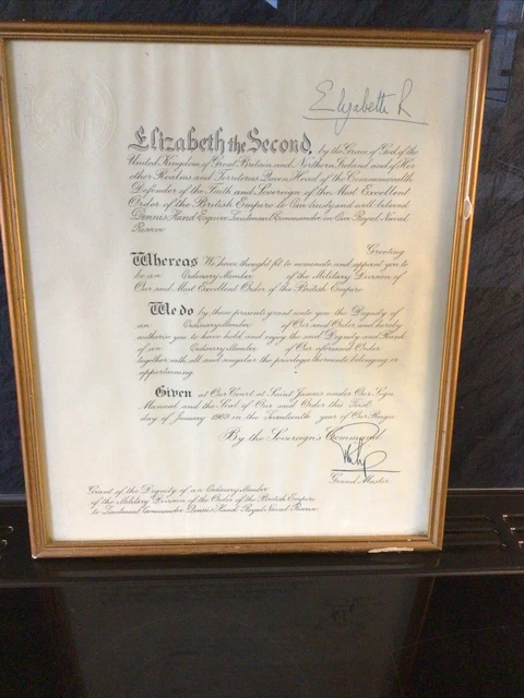 QUEEN ELIZABETH II Hand Signed OBE Certificate Royal Document Cipher