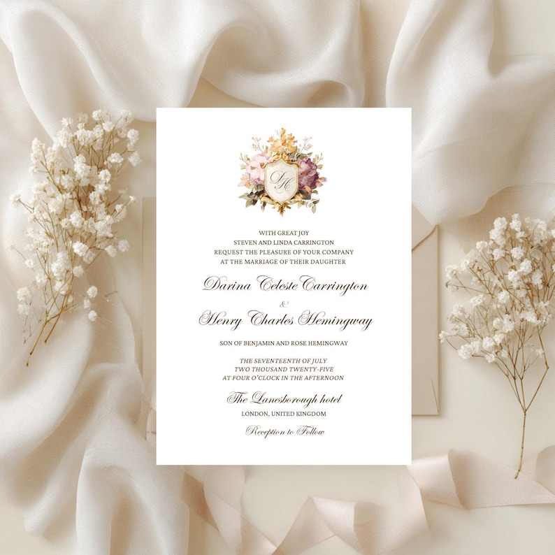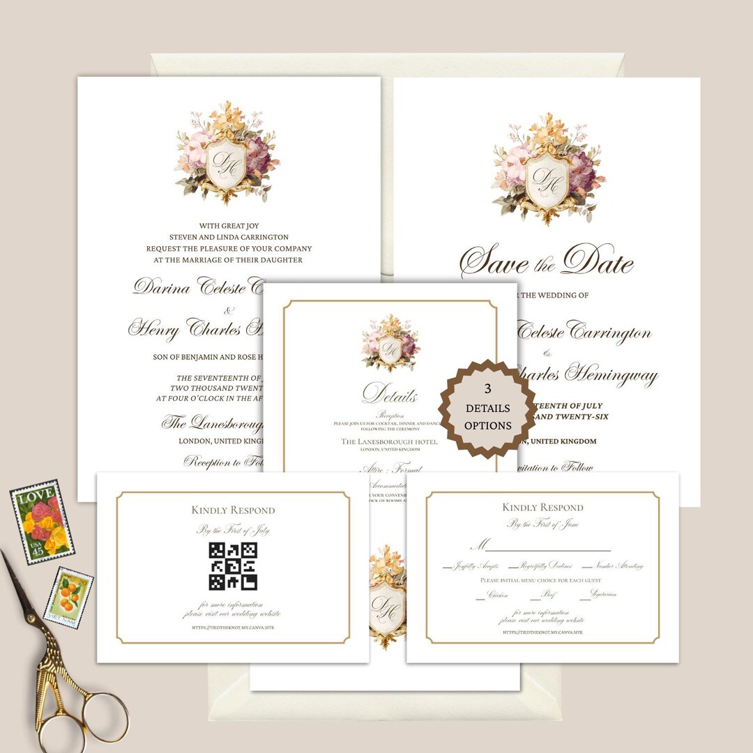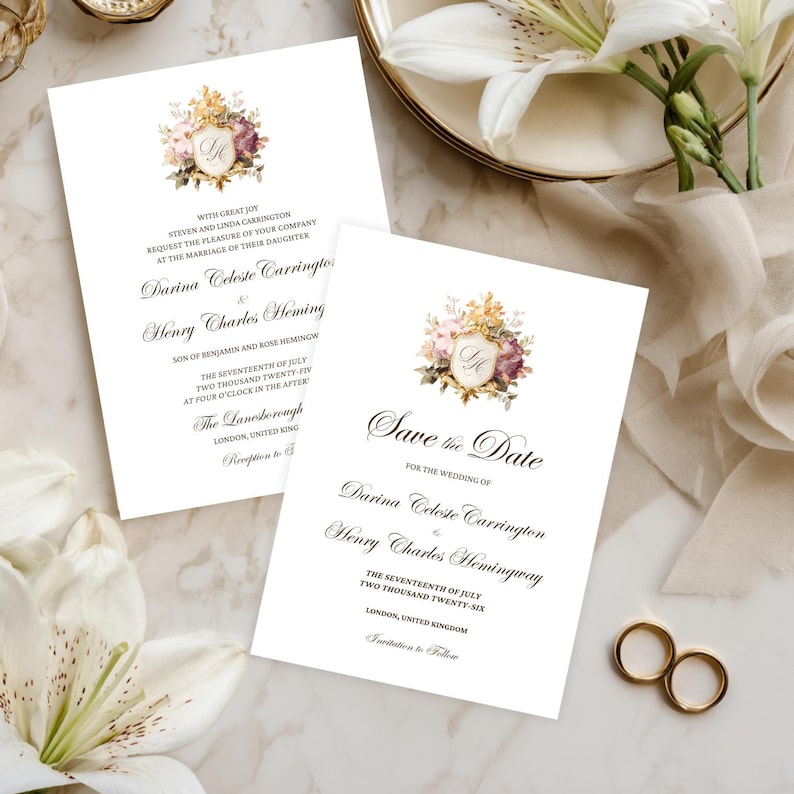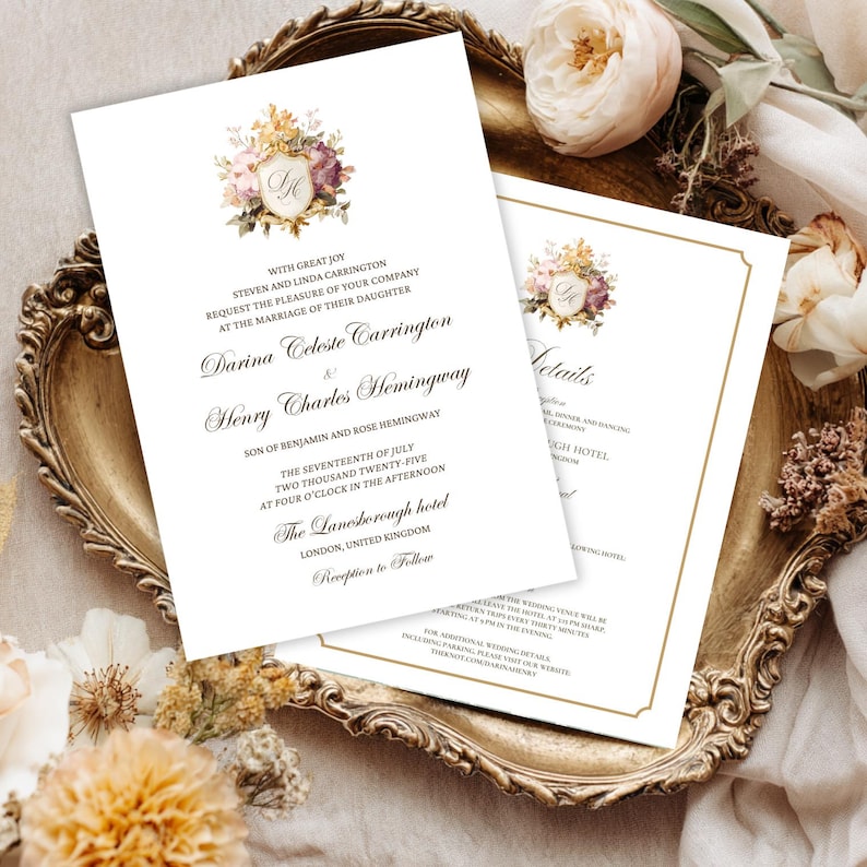 Editable Floral Crest Wedding Monogram Invitation Bundle Canva Template