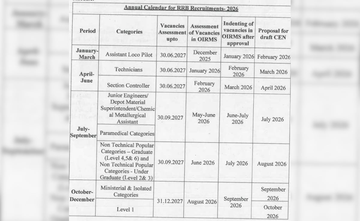 RRB exam calendar 2026 released for key railway recruitment exams