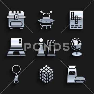 Set Chess Rubik cube Burger Earth globe Magnifying glass Laptop
