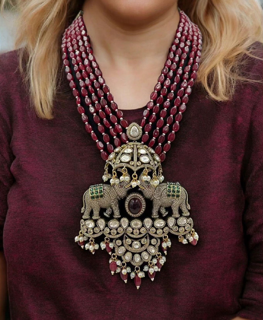 Royal Sabyasachi Inspired Ruby Red Emerald Green Two Layered Pendant