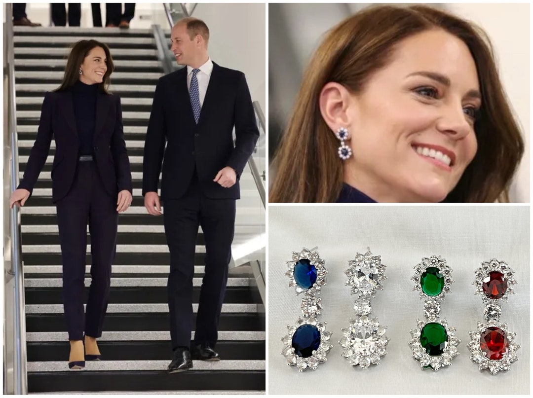 Kate Middleton Sapphire Blue Double Zircon Drop Post Earrings Ruby Red