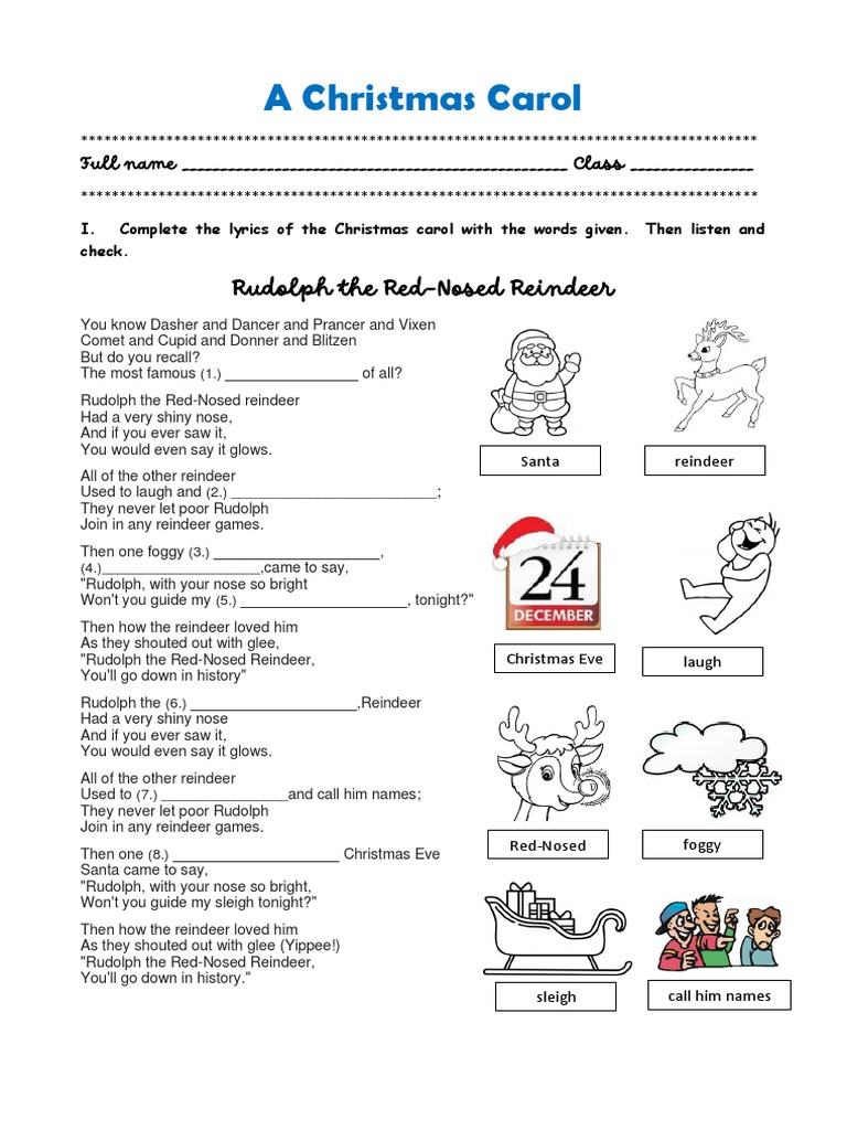 Rudolph the Red nosed Reindeer Song ESL worksheet by Vickiii