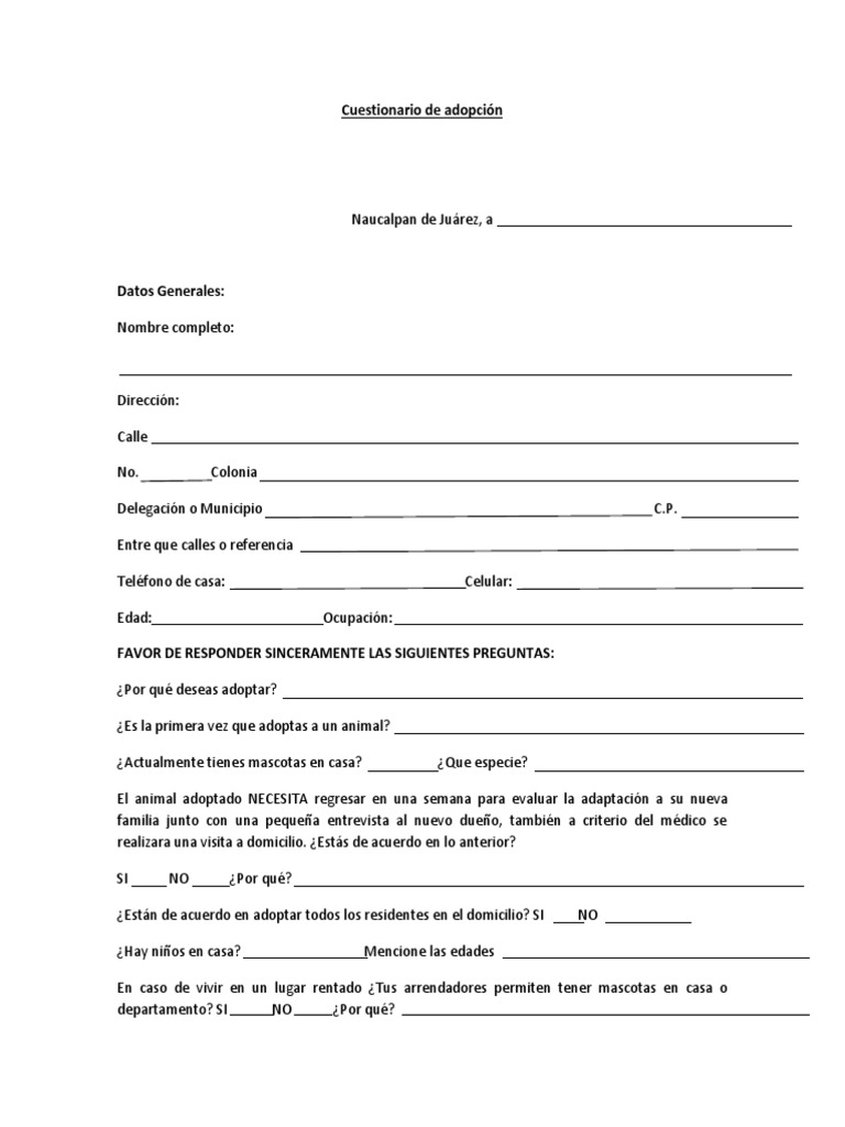 Cuestionario de adopción Veterinaria PDF Mascota Adopción