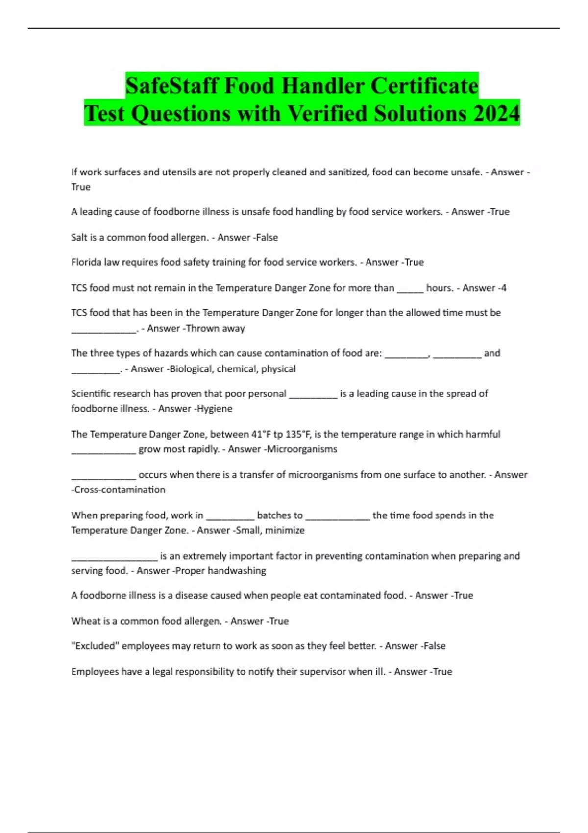 Food Handler Certificate Exam Questions and Answers: Safestaff Program