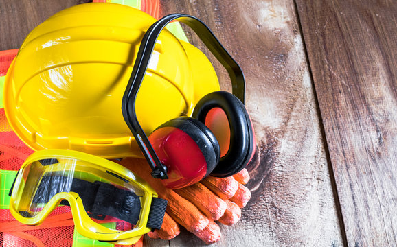 Premium Photo Safety helmet with earphones and goggles on