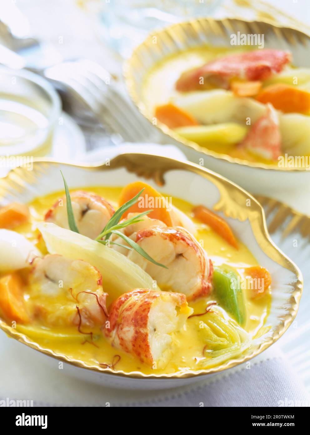 Lobster and vegetables in saffron flavored stock Stock Photo Alamy