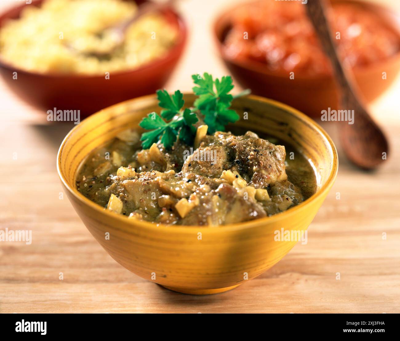 Lamb curry with saffron flavored rice and tomato chutney Stock Photo