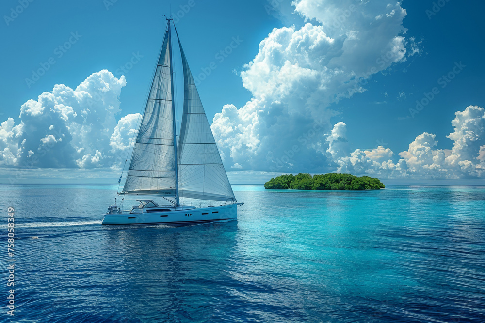 Sailing on a yacht amidst the vast blue sea under sunny skies Stock