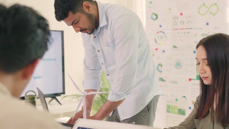 Business analytics team meeting project manager showing corporate