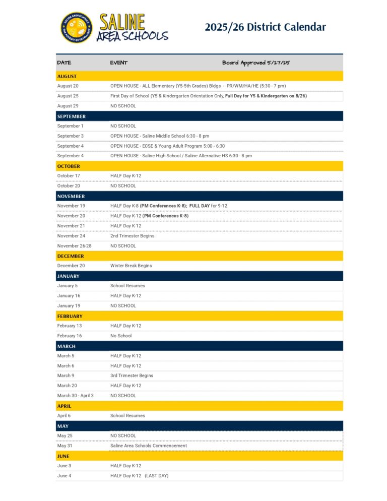 Saline Area Schools Calendar 2026 2027