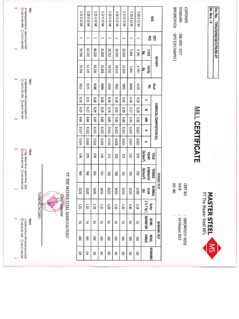 test certificate Material Test Certificate Chemical Analysis Heat No