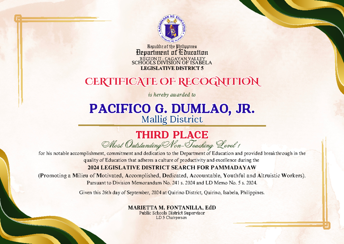 2024 LD 5 Certificate of Recognition for Outstanding Educators in