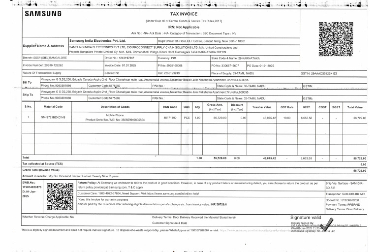 Samsung Invoice 11508355576 7143202778 19E0I0126799 TAX INVOICE