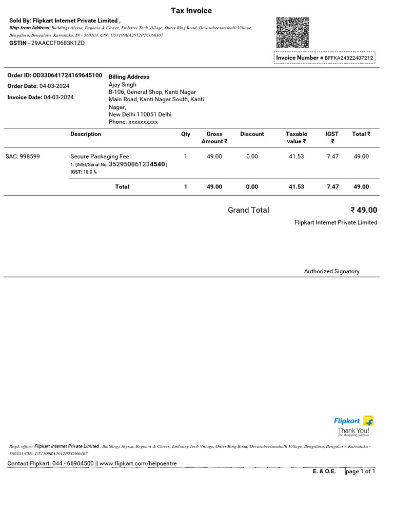 Invoice for Ajay Singh #39 s Order PDF