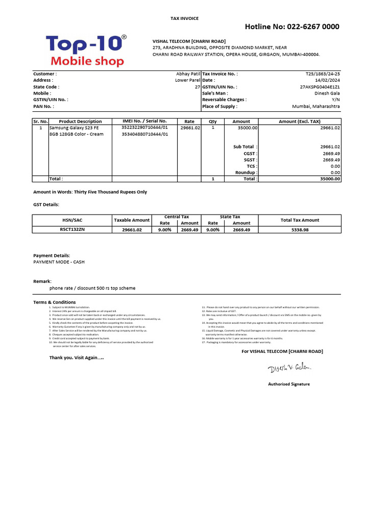 Top10 Samsung S23 FE 8GB PDF Payments Invoice