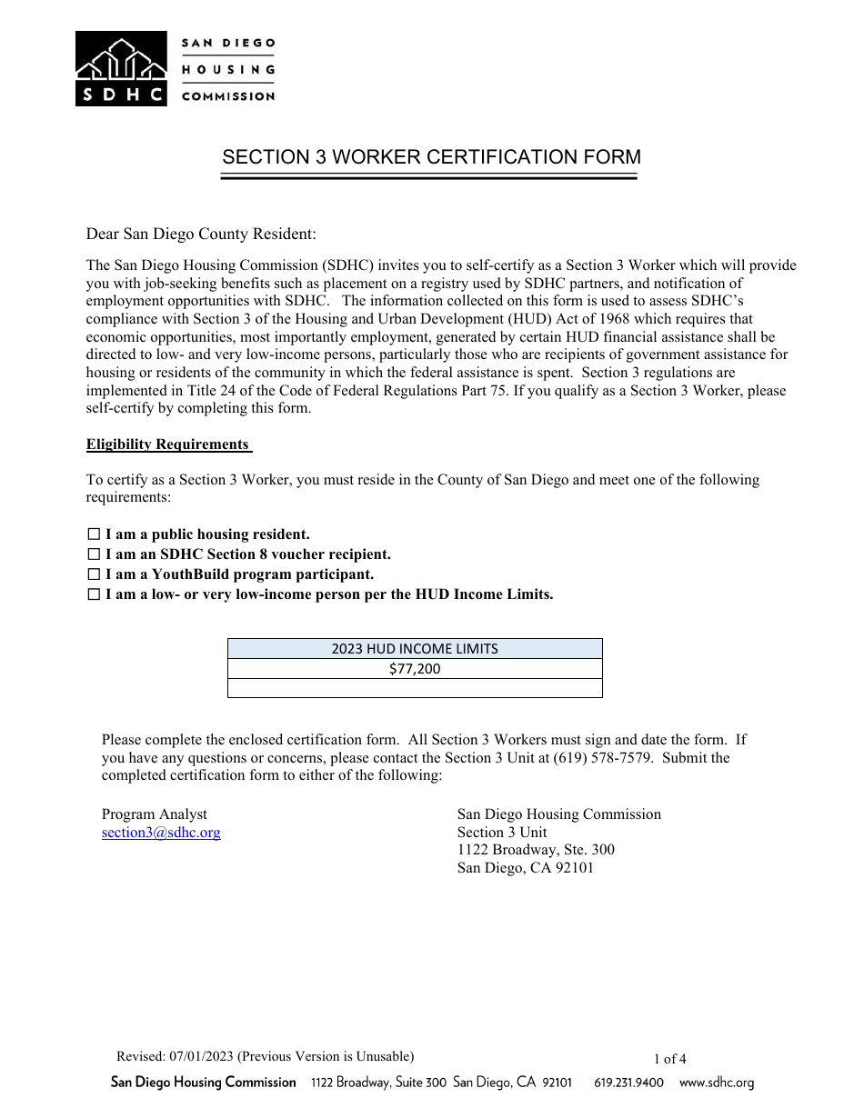 City of San Diego California Section 3 Worker Certification Form