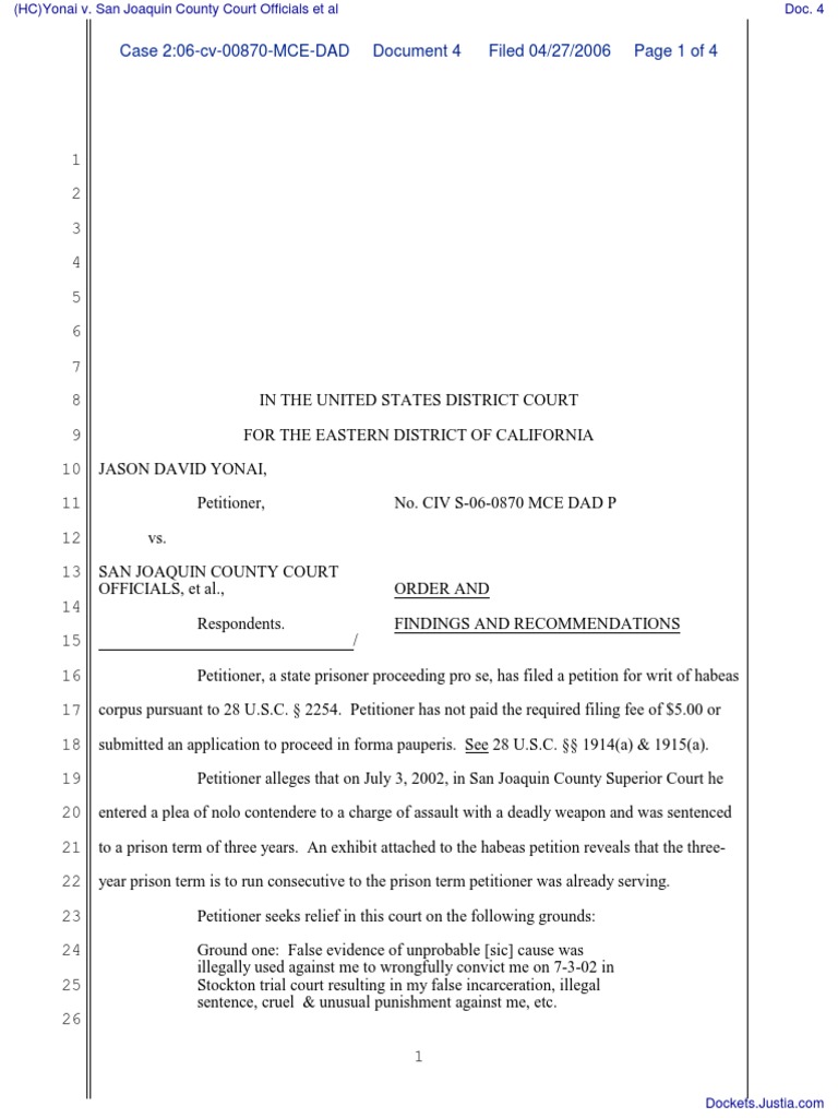 (HC) Yonai v San Joaquin County Court Officials Et Al Document No 4