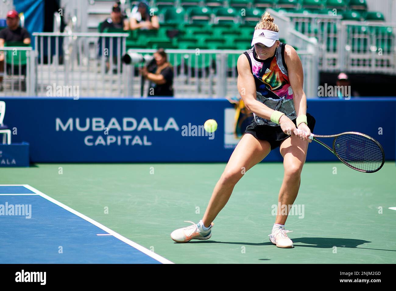 SAN JOSE CA AUGUST 01: Katie Boulter (GBR) serves at the MUBADALA