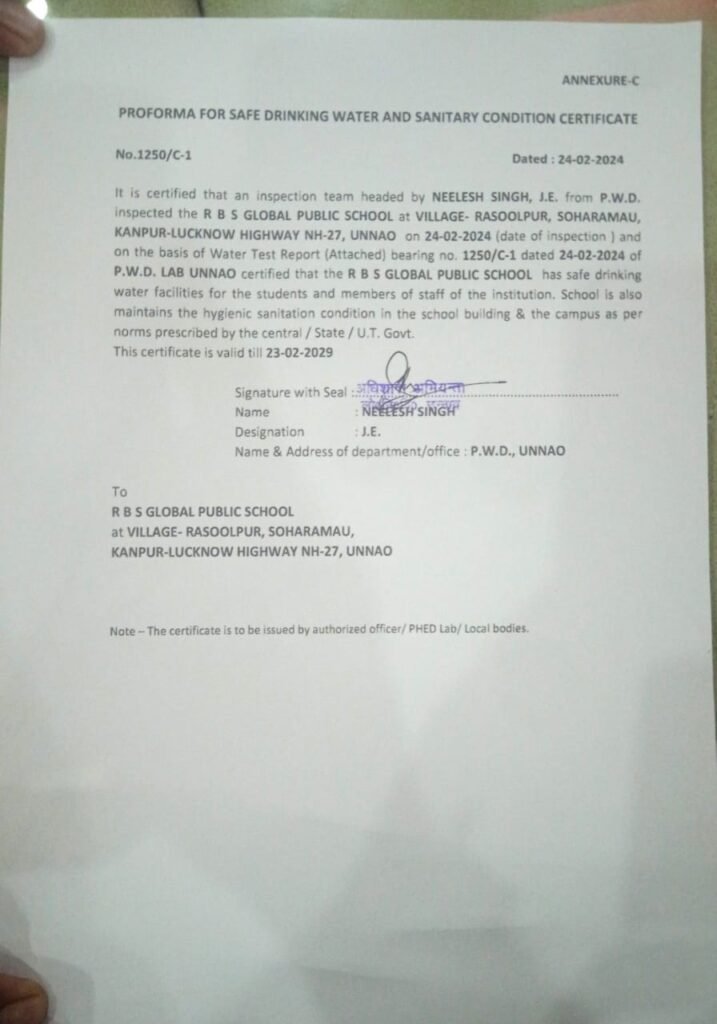 WATER AND SANITATION CERTIFICATE RBS Global Public School