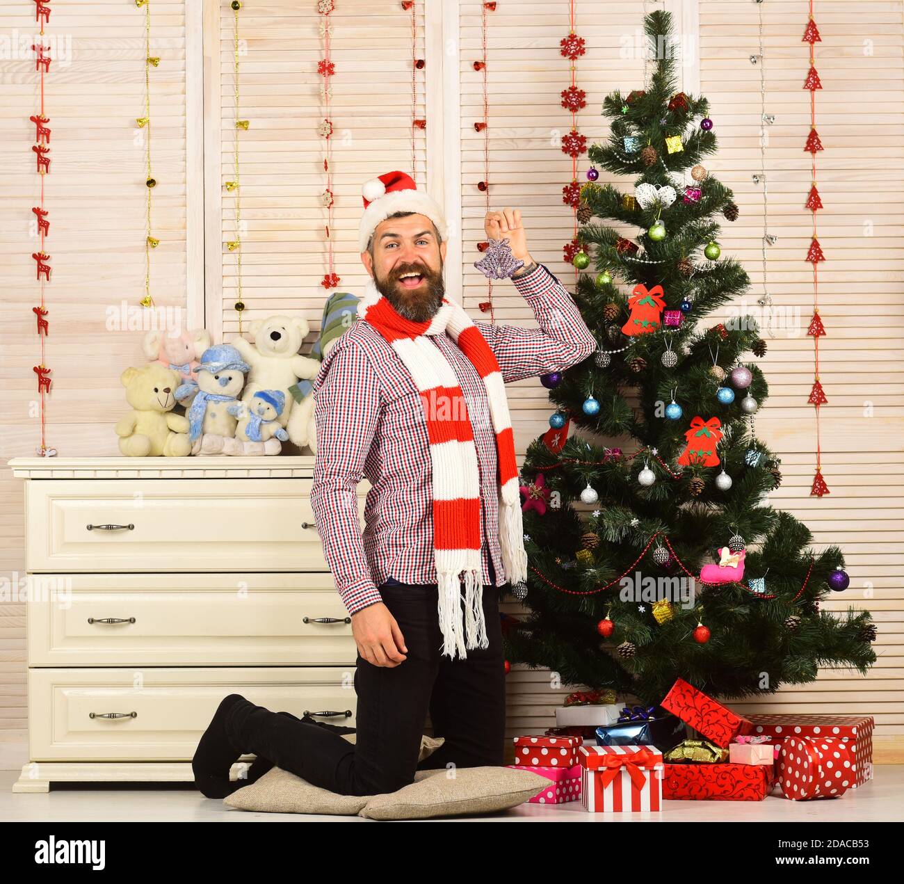 Guy stands by Christmas tree Santa Claus with cheerful face on wooden