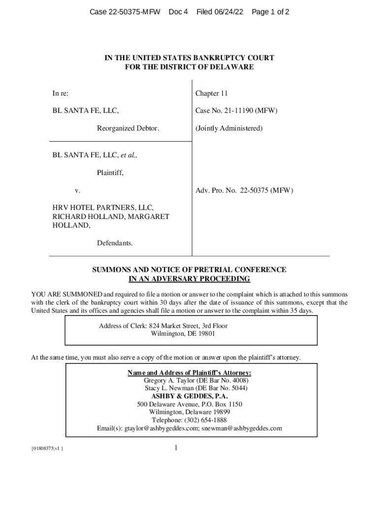 Fillable Online BL Santa Fe Summons and Notice of Pre Trial Conference