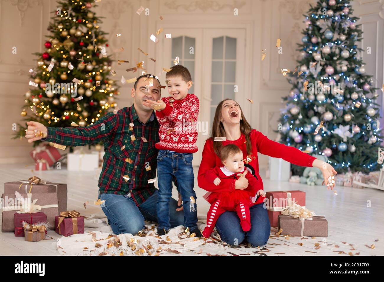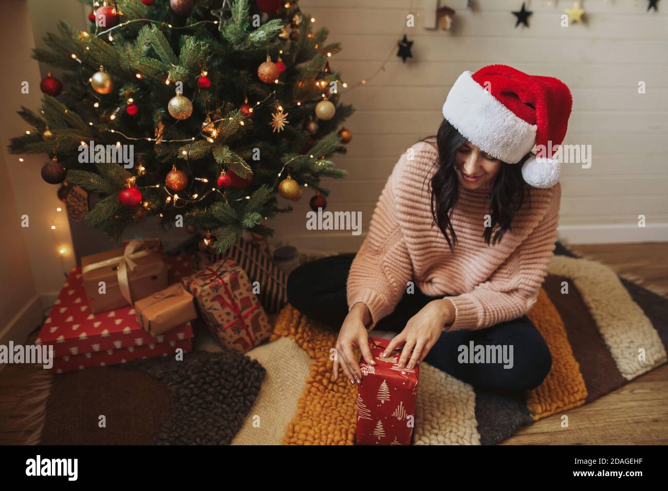 Happy young woman in santa hat wrapping christmas gift in modern paper
