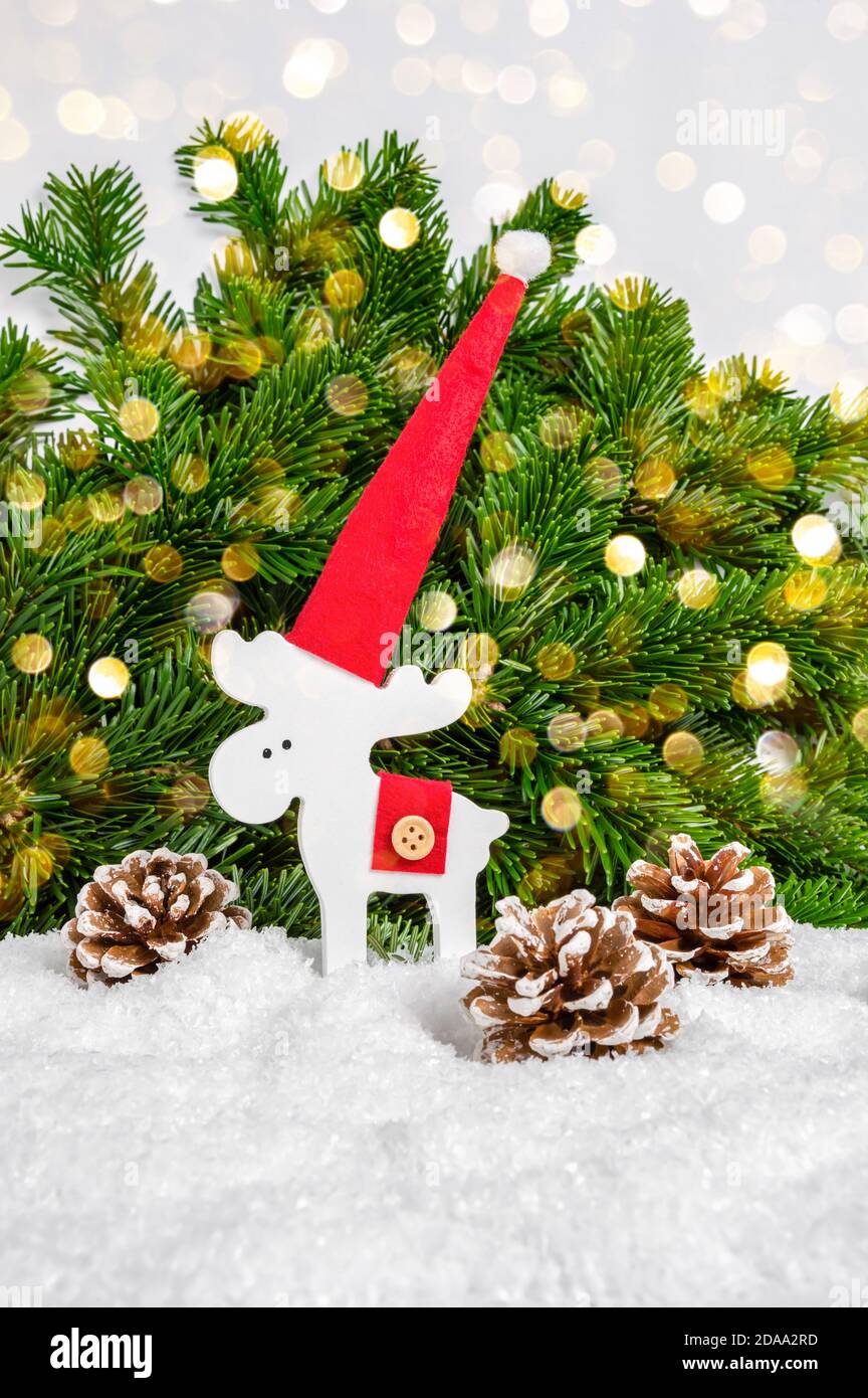 White Christmas reindeer in red Santa hat and pine cones in snow with