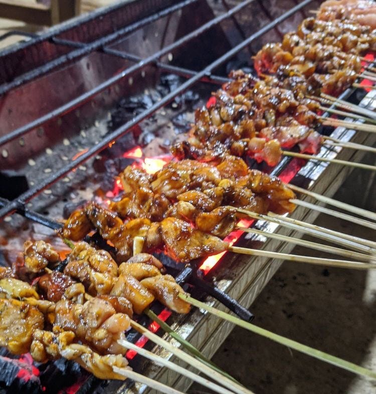 Sate Ayam (Chicken Satay) with Peanut Sauce and Lontong (rice Cake