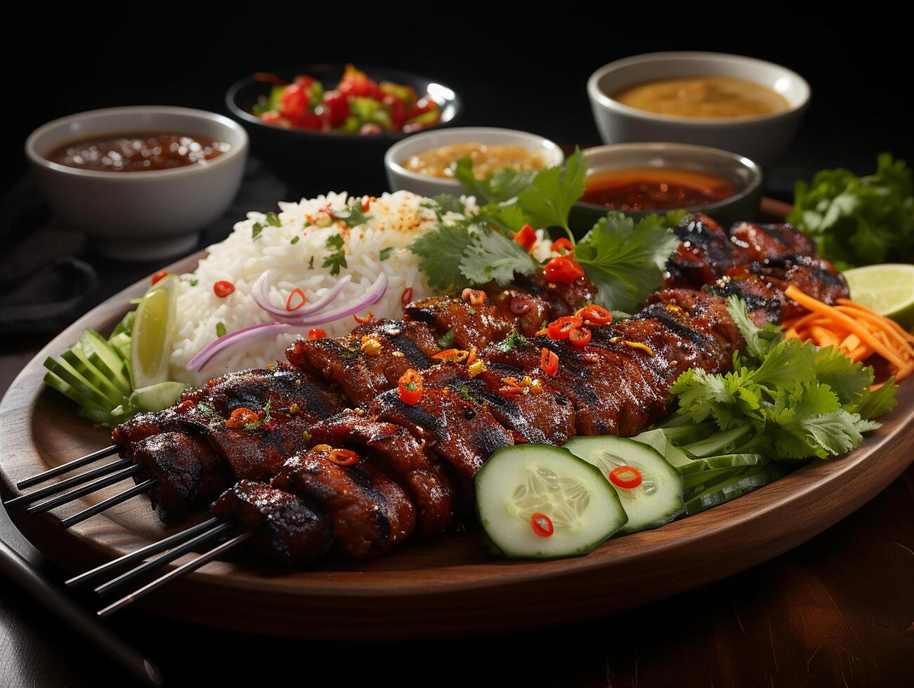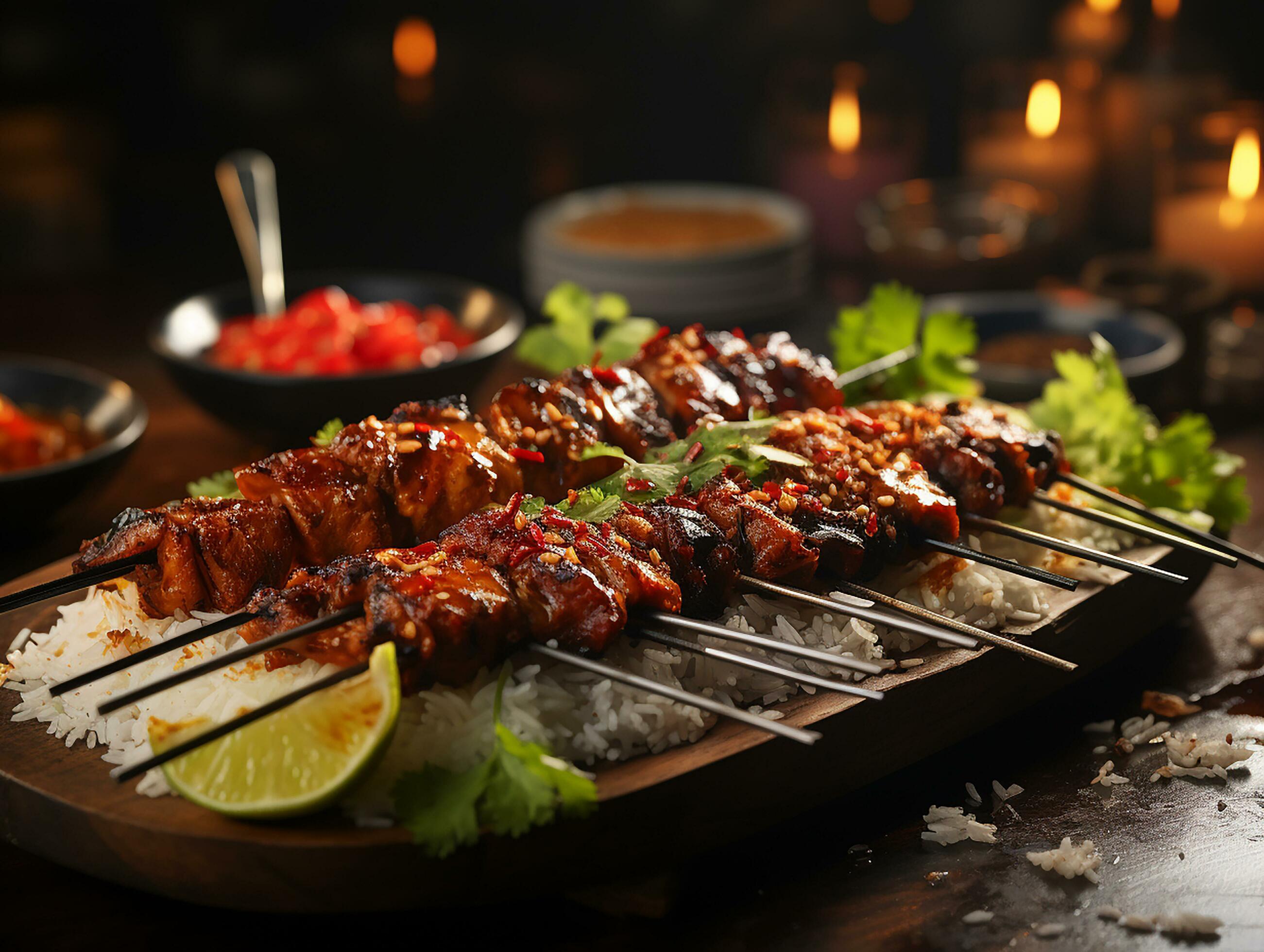 photography of sate with peanut sauce on wooden table AI generated