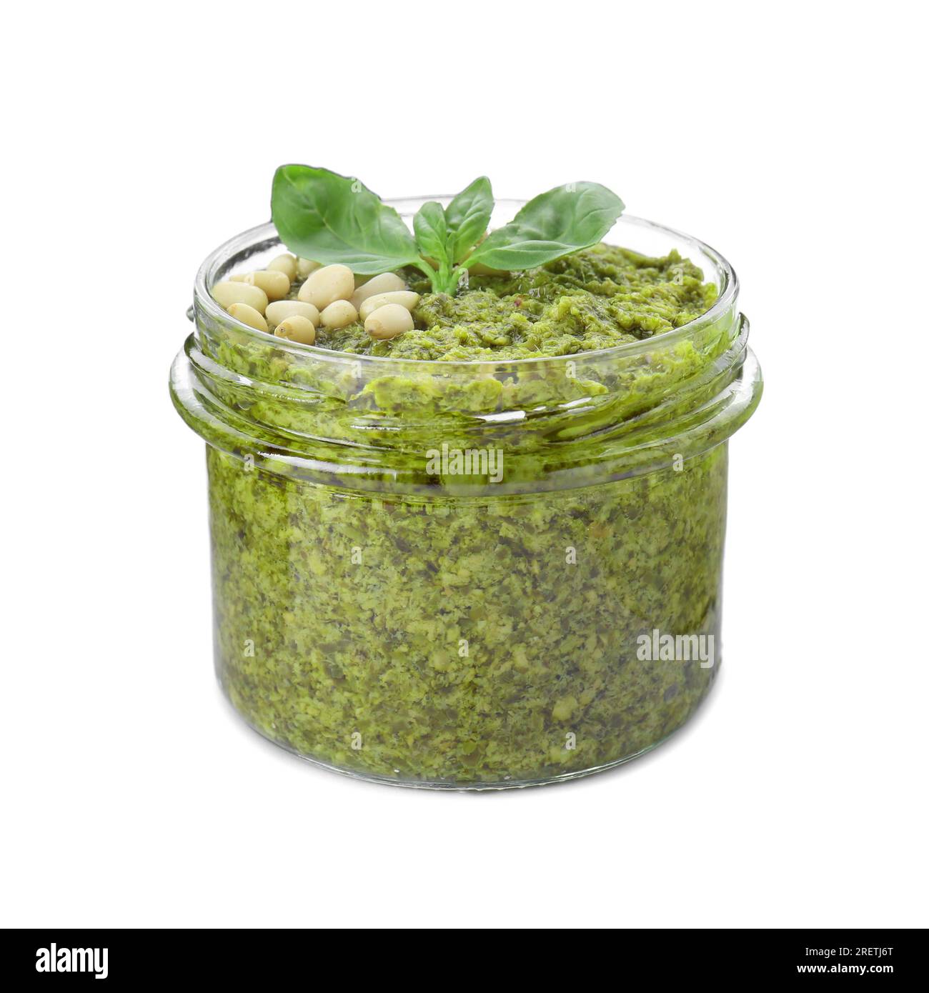 Delicious Pesto Sauce Pine Nuts and Basil Leaves in Jar Isolated on