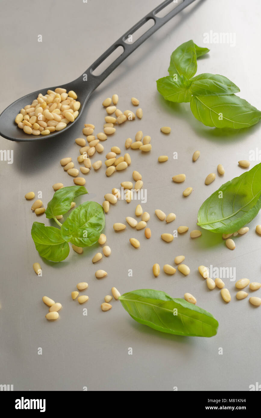 Ingredients for pesto sauce: pine nuts and basil leaves Stock Photo Alamy