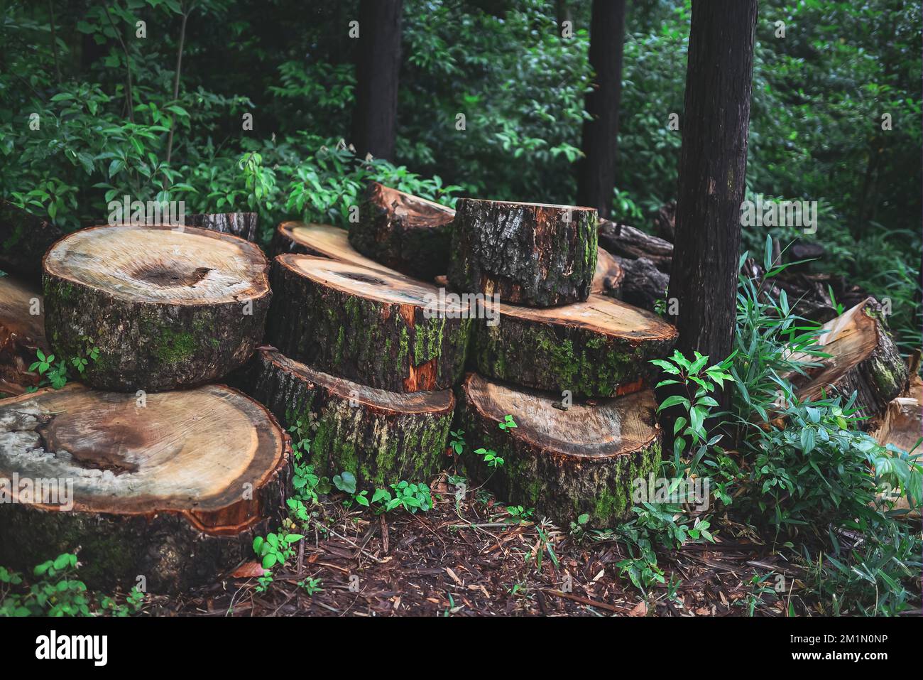 A stack of sawed logs in the green forest in spring Stock Photo Alamy