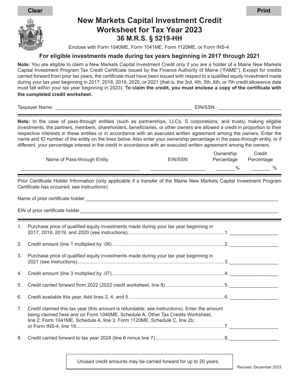 2023 Maine New Markets Capital Investment Credit Worksheet Download