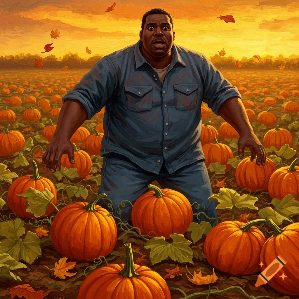 A scared man stands in a pumpkin patch at sunset illustration on Craiyon