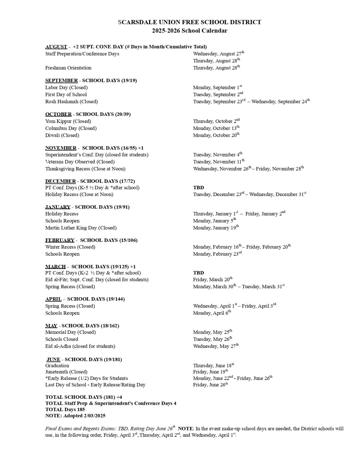 Scarsdale Public Schools Calendar 2025 2026 PDF Holidays
