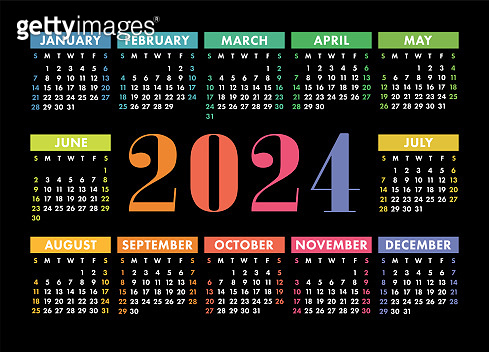 Calendar 2024 English colorful vector horizontal wall or pocket