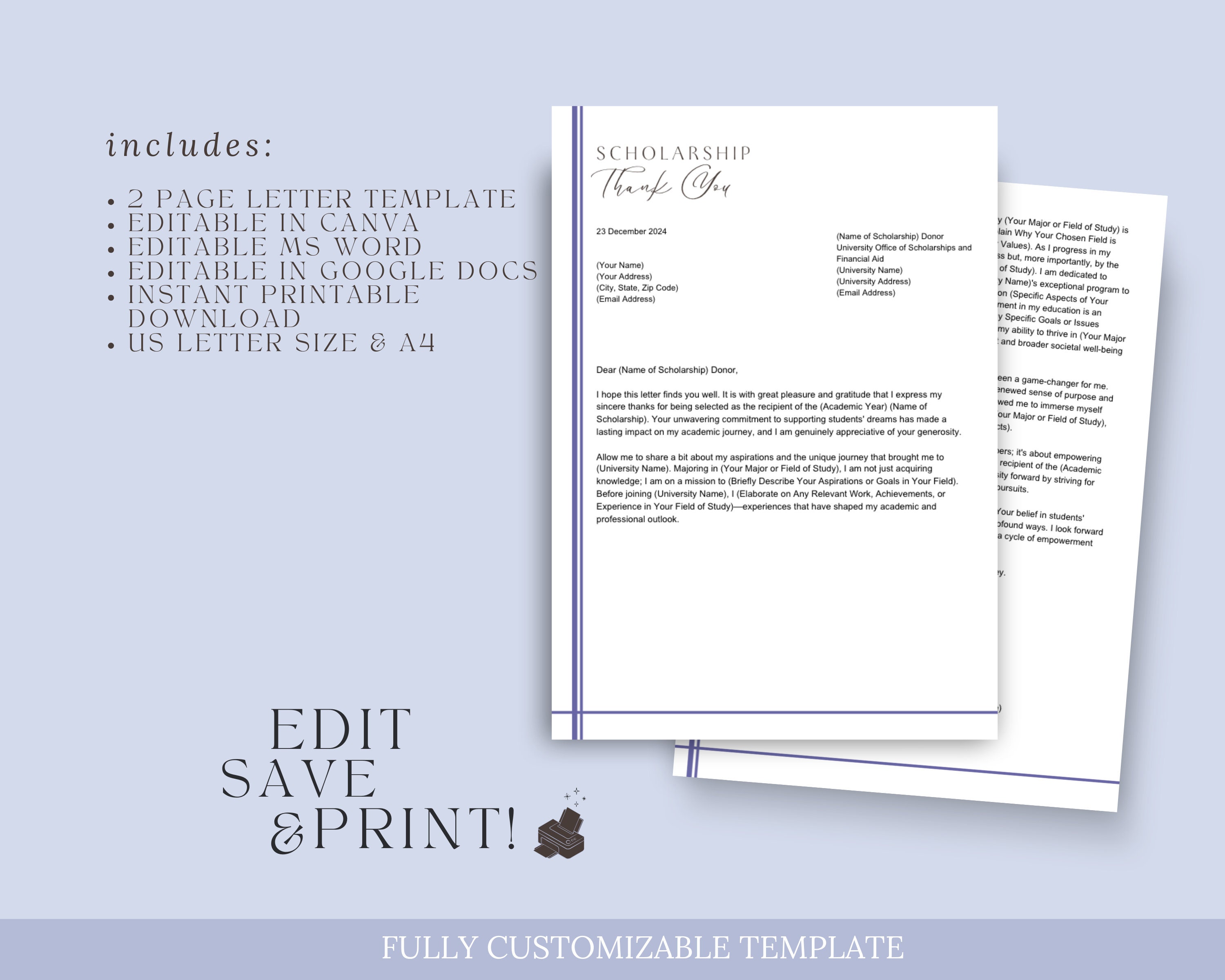 Scholarship Thank You Letter Template Google Docs/microsoft Word Etsy