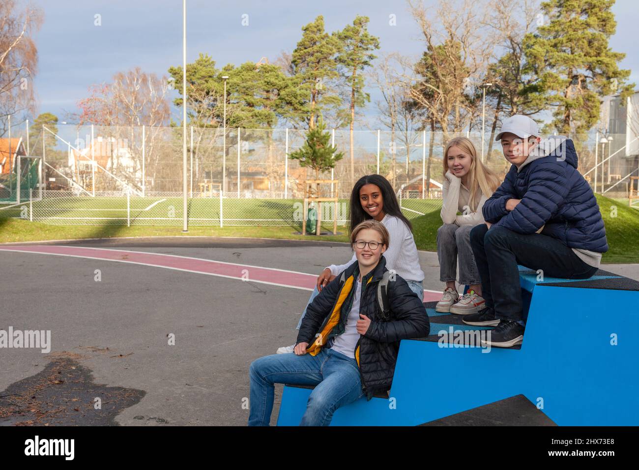 Portrait of teenage friends sitting in schoolyard Stock Photo Alamy