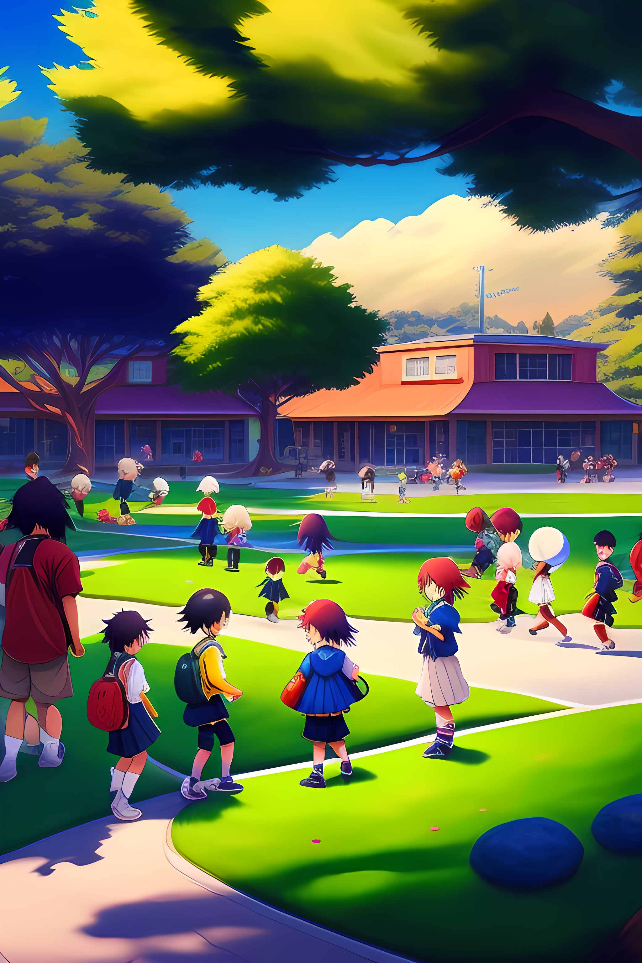Lexica Anime landscape of a schoolyard packed with playing kids with