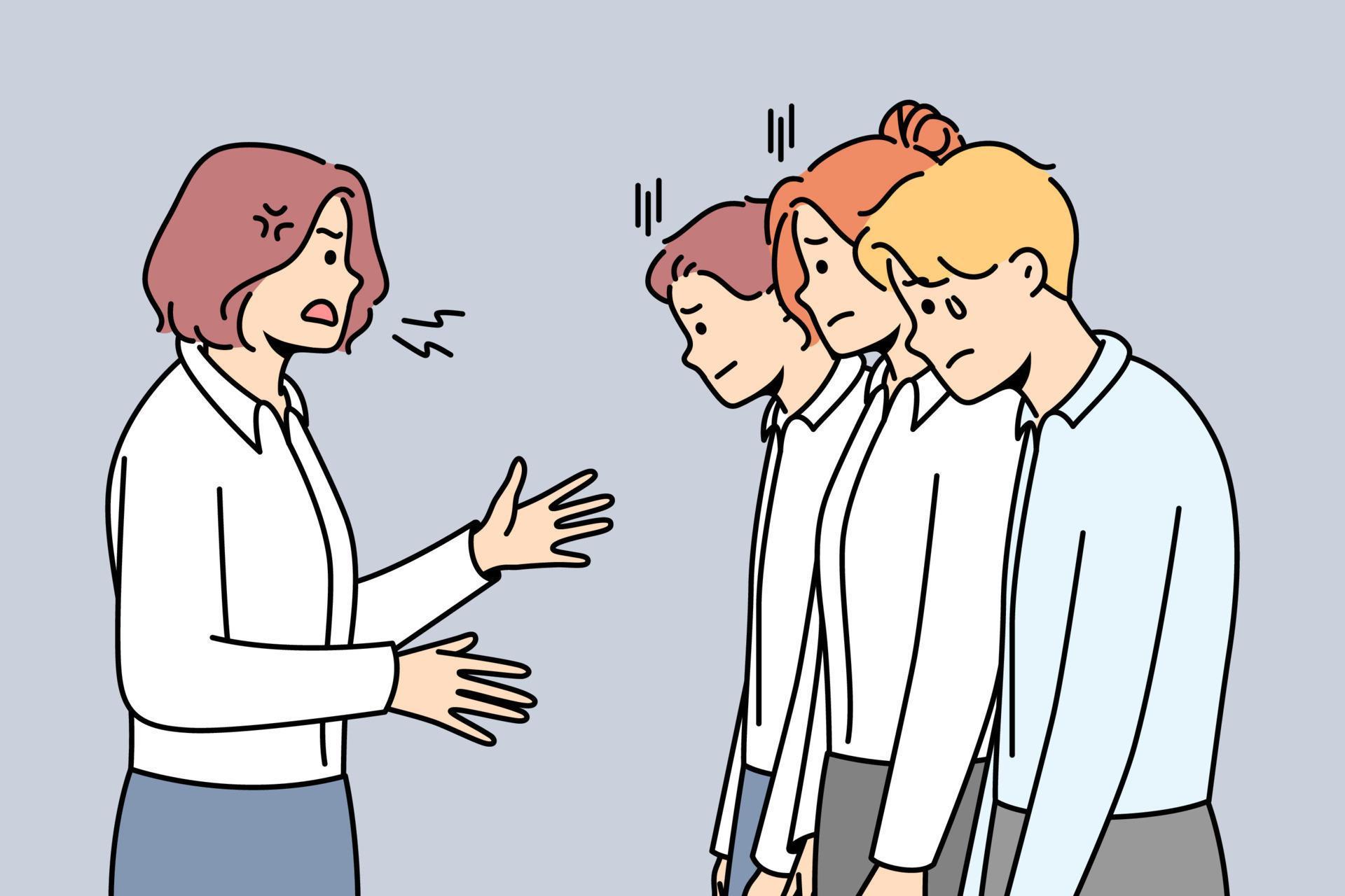 Furious businesswoman scream and scold stressed employees at workplace