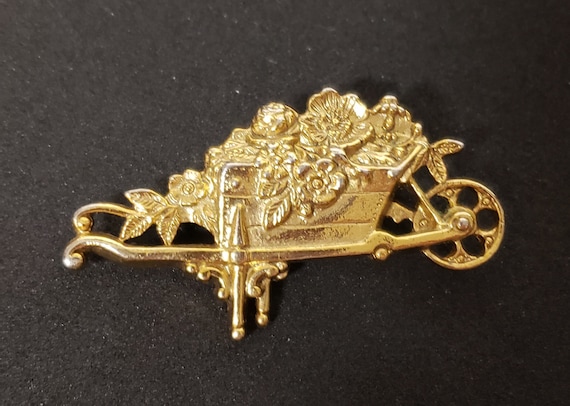 1928 Brand Gold Tone Wheelbarrow of Flowers Brooch Gem