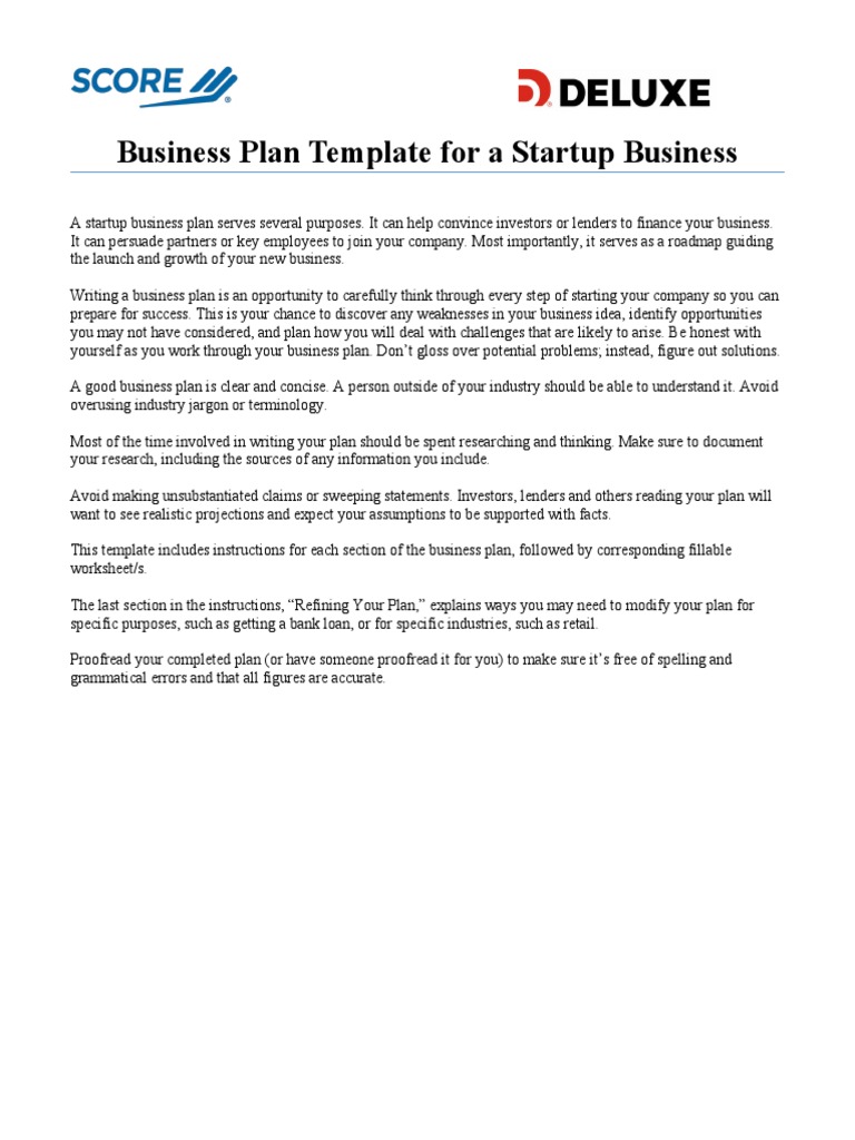 Score Business Plan Template For A Startup Business