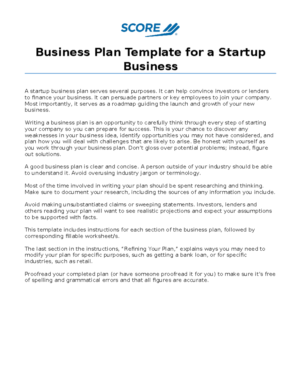 Score Startup Business Plan Template
