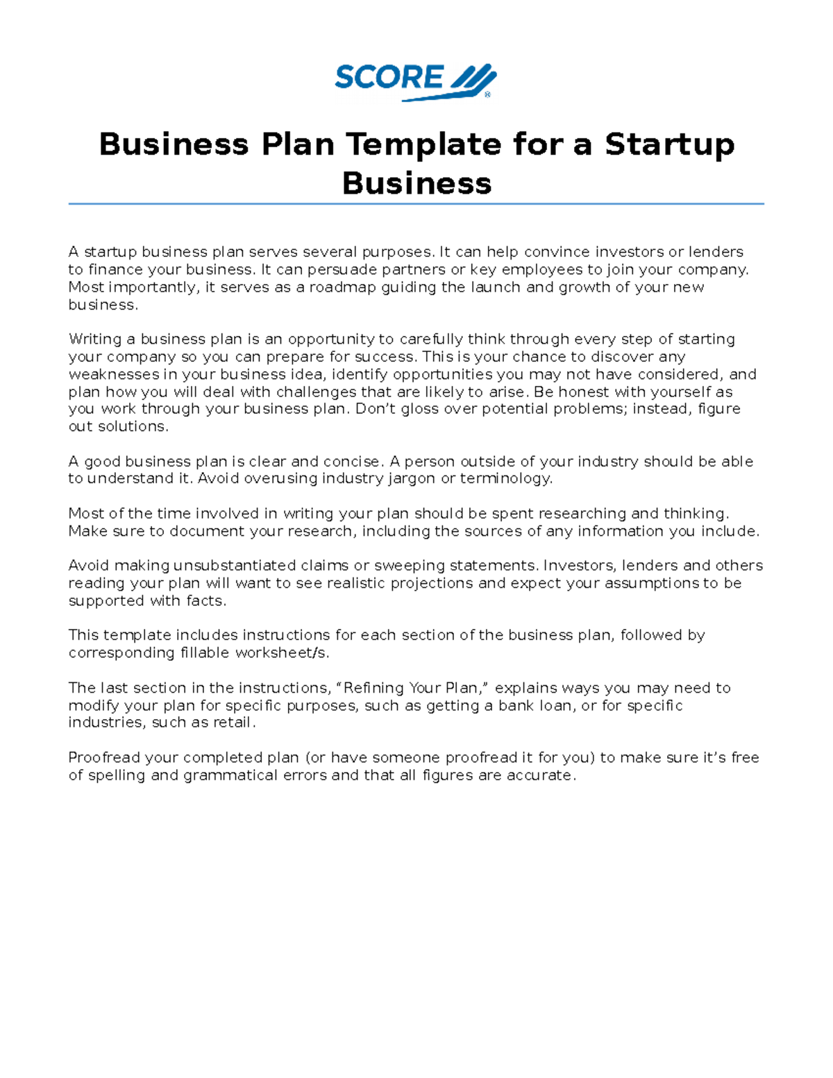 SCORE Startup Business Plan Template PDF Marketing Pricing