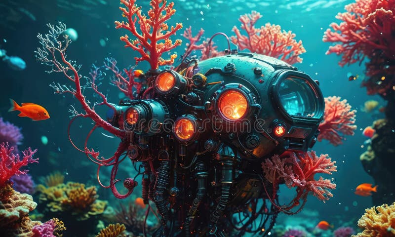 A Jellyfish Shaped Like a Submarine is in the Ocean Stock Illustration